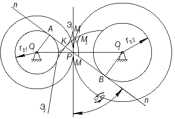 . В точке касания нормаль должна быть общей к обоим профилям и, следовательно, точка К лежит на общей касательной к основным окружностям. При вращении звеньев 1 и 2 точка касания эвольвент перемещается по отрезку АВ этой касательной, так как вне отрезка АВ эвольвенты не могут касаться, то есть иметь общую нормаль. Отсюда следует, что линия зацепления эвольвентных профилей совпадает с общей нормалью к ним и лежит на отрезке АВ общей касательной к основным окружностям. Точка Р – полюс зацепления занимает неизменное положение, следовательно центры в относительном движении представляют собой окружности с радиусами