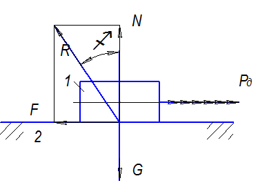 Поступательная кинематическая пара, состоящая из горизонтальной направляющей 2 и ползуна 1, показана на рисунке 3.14. Пусть на ползун 1, действуют следующие силы: PД - движущая, G - вес груза или нагрузка, действующая на ползун, N - нормальная реакция, F0 - сила трения (касательная реакция) при покое. При движущемся ползуне вместо силы трения F0 действует сила трения F при движении, причем
