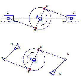 На рисунке 4.4 показаны схемы симметричных кривошипно-ползунного и шарнирного четырёхзвенного механизмов. В тех случаях, когда размещение звеньев в симметричных механизмах очень громоздко или подбор масс конструктивно нецелесообразен, применяется метод установки противовесов.