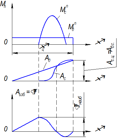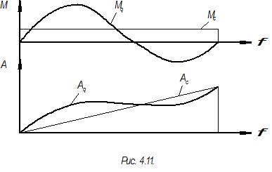 Обычно нагрузка на машину задается в виде графика приведенных моментов сил сопротивления и по этой нагрузке подбирается соответствующий двигатель, момент которого задается в виде графика приведенных к звену приведения движущих сил. Интегрируя эти графики на протяжении одного цикла, получают работу сил движущих и сил сопротивления за цикл (рис. 4.8). Для установившегося движения (Ад) цикла = (Ас) цикла – это является основным условием установившегося движения и служит основанием для определения мощности двигателя.