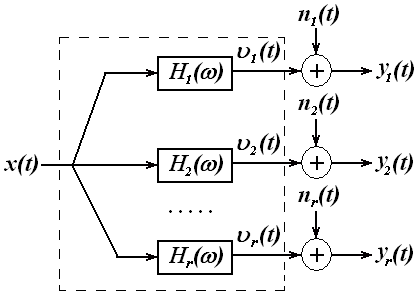 Соотношения (3.3), (3.4) для i –го тракта рассматриваемой системы в точности совпадают со спектральными соотношениями (2.31), (2.32) для системы с одним входом и одним выходом при наличии внешнего шума на выходе.
