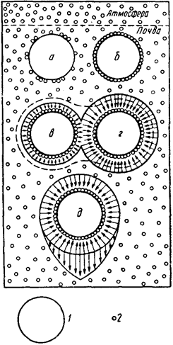 1 - частицы грунта; 2 - молекулы воды в виде пара; а - частицы с неполной гигроскопичностью; б - частицы с максимальной гигроскопичностью; в и г - частицы с пленочной водой (вода движется от частицы г к частице в, окруженной более тонкой пленкой воды); д - частица с гравитационной водой