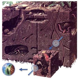 Живая часть почв состоит из почвенных микроорганизмов (бактерии, грибы, актиномицеты, водоросли и др.) и представителей многих групп беспозвоночных животных – простейших, червей, моллюсков, насекомых и их личинок, роющих позвоночных и др. (см. Почвенная фауна). Активная роль живых организмов в формировании почв определяет принадлежность её к биокосным природным телам – важнейшим компонентам биосферы.