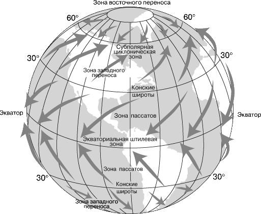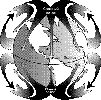 Основные пояса ветров в атмосфере образуются благодаря вращению Земли вокруг своей оси. Стрелками показаны направления ветров в приземном слое атмосферы. В Северном полушарии вращение Земли отклоняет устремляющиеся на юг ветры к западу, а направляющиеся на север – к востоку.