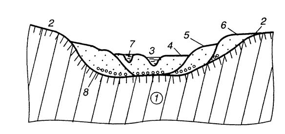 1 – коренные породы; 2 – склон; 3 – русло; 4 – пойма; 5 – первая надпойменная терраса; 6 – вторая надпойменная терраса; 7 – старица; 8 – дно долины.