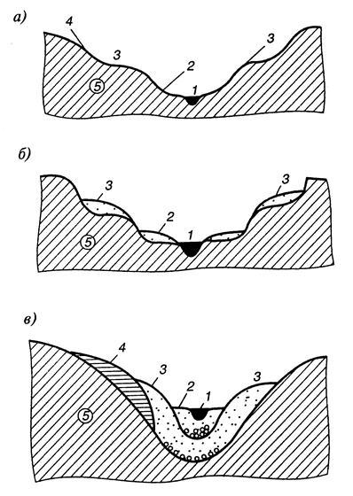 а – эрозионные; б – цокольные; в – аккумулятивные; 1 – русло; 2 – пойма; 3 – первая надпойменная терраса; 4 – вторая надпойменная терраса; 5 – коренные породы.