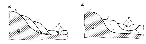 а – вложенные; б – наложенные; 1 – русло; 2 – пойма; 3-5 – надпойменные террасы; 6 – коренные породы.