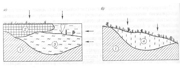 а – низинное; б – верховое; 1 – минеральное дно; 2 – торф; 3 – ил;