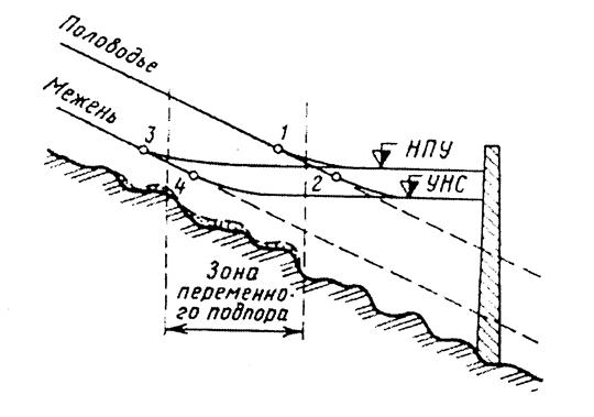 1, 2 - русловые границы участка выклинивания подпора в половодье;