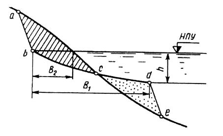 Переработка берегов идет наиболее интенсивно в первые годы эксплуатации водохранилищ, а затем постепенно затухает. Период активной переработки берега занимает обычно от 5 до 10 лет, а для стабилизации берега требуется 20-30 лет. Характер переформирования берегов показан на рис. 21.3. Разбиваясь о береговой склон, волны подмывают берег примерно на высоте нормального подпорного уровня. Надводный откос обрушается, часть обрушившегося материала, состоящая из мелких частиц, взвешивается в волноприбойной зоне и может быть унесена далеко от места обрушения. Однако большая часть материала остается на месте, формируя подводный пляж. Процессы подмыва и обрушения берега прекращаются тогда, когда ширина пляжа становится настолько большой, что, вкатываясь по пляжу, разбитая волна теряет свою кинетическую энергию.