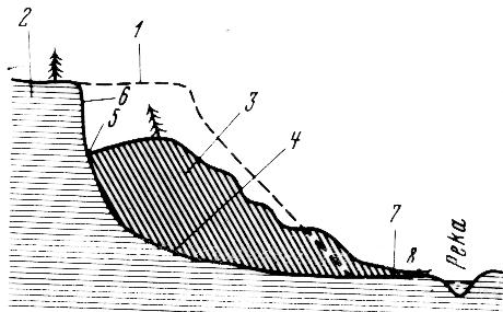 1- первоначальное положение склона, 2- ненарушенный склон, 3- оползневое тело, 4- поверхность скольжения, 5- тыловой шов, 6- надоползневой уступ, 7- подошва оползня, 8- источник
