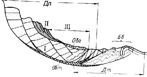 Дл - деляпсивная часть оползня; Дт - детрузивная часть оползня; Бв - бугор выпирания; Обт - оползневые брекчии трения; Обо - отложенные оползневые брекчии оползня поточного типа; I- крупноблоковые оползни первой стадии; II- малые блоковые оползни второй стадии; III- поточный оползень третьей стадии.