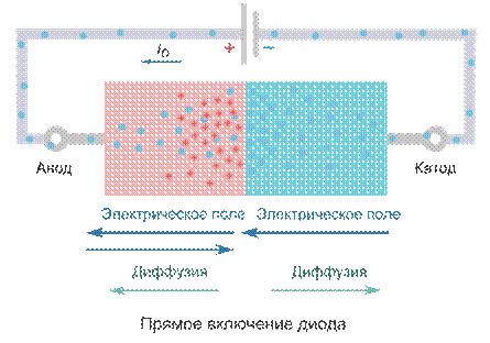 Меняем полярность источника питания - плюс к аноду, минус к катоду (рис 3.6.). В таком положении, между зарядами одинаковой полярности возникает сила отталкивания. Отрицательно заряженные электроны отдаляются от минуса и двигаются сторону pn перехода. В свою очередь, положительно заряженные дырки отталкиваются от плюса и направляются навстречу электорнам. PN переход обогащается заряженными частицами с разной полярностью, между которыми возникает электрическое поле – внутреннее электрическое поле PN перехода. Под его действием электроны начинают дрейфовать на сторону P. Часть из них рекомбинируют с дырками (заполняют место в атомах, где не хватает электрона). Остальные электроны устремляются к плюсу батарейки. Через диод пошел ток ID.