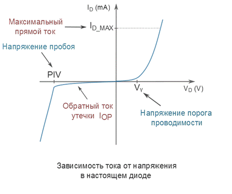 Однако на практике, в силу своей полупроводниковой структуры, настоящий диод обладает рядом недостатков и ограничений по сравнению с идеальным диодом. Это можно увидеть на графике, приведенном ниже (рис 3.8.).