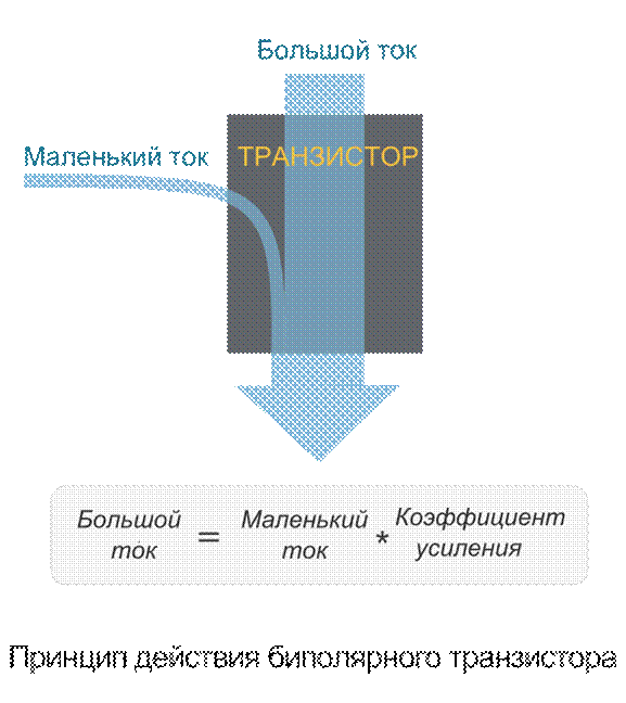Принцип работы обоих типов транзисторов (рис 4.4.) похож на работу водяного крана, который регулирует водяной поток, только через транзистор проходит поток электронов. У биполярных транзисторов через прибор проходят два тока - основной "большой" ток, и управляющий "маленький" ток. Мощность основного тока зависит от мощности управляющего. У полевых транзисторов через прибор проходит только один ток, мощность которого зависит от электромагнитного поля. В данной статье рассмотрим подробнее работу биполярного транзистора.