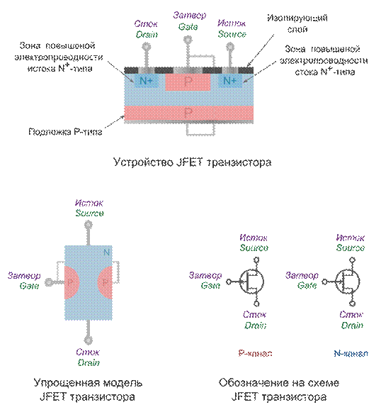 Как показано на рисунке 4.11, область полупроводника N-типа формирует канал между зонами P-типа. Электроды, подключаемые к концам N-канала, называются сток и исток. Полупроводники P-типа электрически соединяются между собой (закорачиваются), и представляют собой один электрод – затвор.