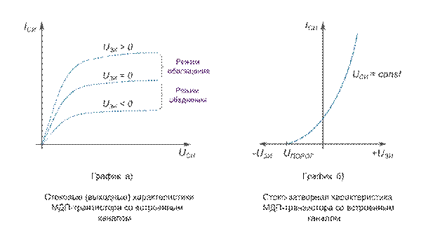 Как мы видим, МДП-транзистор со встроенным каналом способен работать в двух режимах - в режиме обеднения и в режиме обогащения.