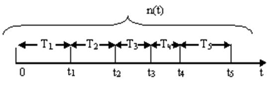 Например (рис.), отказы объекта происходят в случайные моменты времени ti. Замена отказавших элементов происходит мгновенно. За суммарную наработку t происходит n(t) отказов.