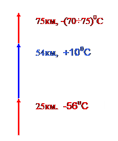В следующей зоне (12-80км) – стратосфера температура на участке 12-25км высоты достигает -560С, а затем начинает расти и на высоте 48-54км температура достигает +100С, а затем снова начинает падать, достигая на высоте 75км значения –(70÷75)0С.