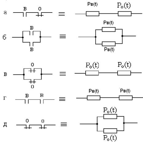 Слева –электрическая схема (кроме рис(а)), справа- схема расчета надежности.