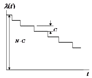 Однако предположение о постоянстве интенсивности обнаружения ошибок в случае программного обеспечения представляется не соответствующим реальности. Для него эта функция должна уменьшаться по мере обнаружения и исправления ошибок. Поэтому, как показано на рис.2,