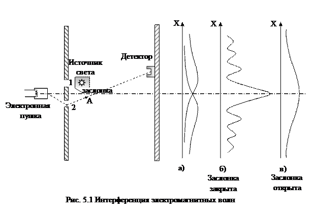 Эти исходные принципы квантовой механики в сжатой форме сформулировал Р. Фейнман в своих знаменитых лекциях по физике на основе рассмотрения прохождения щели электронами(см. рис. 5.1). Мы объединили в одном рисунке интерференцию электронных волн (б) со световым наблюдением за электронами (в).