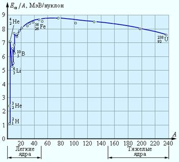 Таким образом, зависимость удельной энергии связи от массового числа объясняет принципиальную возможность получить энергию в ядерных реакциях деления и синтеза.