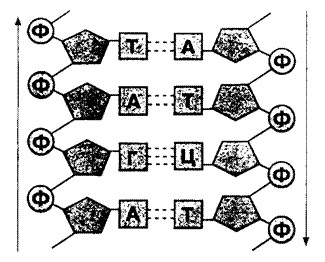 б) Комплементарное соединение полинуклеотидных цепей ДНК.