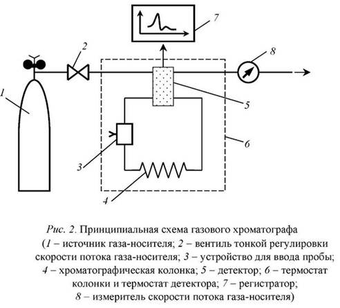 Действие хроматографов основано на предварительном разделении компонентов, составляющих анализируемую смесь, и последующем выделении каждого компонента. Выходной электрический импульс передается на электронный автоматический прибор, записывающий хроматограмму, состоящую из ряда пиков, каждый из которых соответствует определенному компоненту анализируемой смеси. Площадь каждого пика пропорциональна процентному содержанию компонентов смеси.