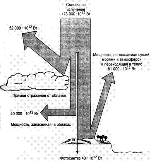 Ультрафиолетовая часть солнечного спектра, которая в энергетическом отношении составляет около 30% всей солнечной энергии, доходящей до Земли, практически полностью задерживается атмосферой. Половина поступающей энергии превращается в тепло и затем излучается в космическое пространство, 20% расходуется на испарение воды и образование облаков и только 0,02% используется биосферой. Зеленые растения усваивают эту энергию, поглощая молекулами хлорофилла, затем в процессе фотосинтеза преобразуют ее и запасают в форме сахаров. От этого процесса зависит все существование биосферы. Животные, поедая растения, а хищники – травоядных животных, освобождают для себя эту энергию, сжигая сахара и другие питательные вещества при помощи кислорода. В результате происходящего метаболизма организмов (фотосинтез, дыхание, брожение и др.) регулируется и поддерживается химический состав атмосферы.