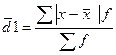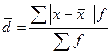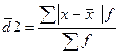 2. Среднее линейное отклонение. Показывает, на сколько в среднем отклоняется каждая варианта от ее среднего значения. Поскольку сумма отклонений от средней всегда равна нулю, все отклонения должны быть положительными, поэтому берутся по модулю. Кроме того отклонения должны быть взвешены, так как имеются в наличии частоты. Формула будет иметь вид: