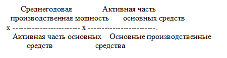 Расчет эффективности использования основных средств можно произвести и с учетом изменения уровня специализации организации, коэффициента использования среднегодовой мощности, доли активной части основных средств в общей их стоимости, фондоотдачи активной части основных средств, исчисленной по мощности. Формула расчета фондоотдачи имеет в этом случае следующий вид: