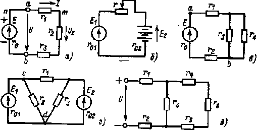 Электрические цепи постоянного тока (как и переменного) и соответственно их электрические схемы бывают весьма разнообразными. Так, встречаются электрические цепи неразветвленные (рис. 1.1, а, б) и разветвленные (рис 1.1, в - д), с одном активным элементом (рис. 1.1, а, в, д) и с двумя (рис. 1.1, б, г) или с большим количеством активных элементов, линейные и нелинейные.