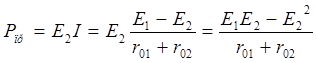 Как видно, ток получается больше тока короткого замыкания, падение напряжения во внутреннем сопротивлении оказывается равным сумме U и Е2, потери мощности в нем получаются равными сумме потребляемой UI и вырабатываемой |Е2I| мощностей и так как мощность, преобразуемая из электрической, Pпp =