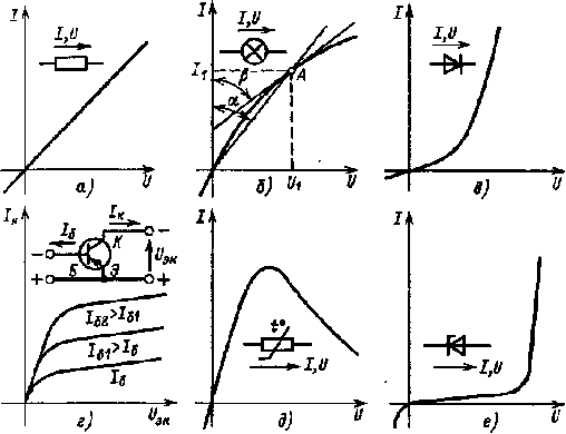 а — линейного элемента; б — лампы накаливания; в - полупроводнико- вого диода; г - транзистора (при различных токах базы), д - терморезистора, е – стабилитрона