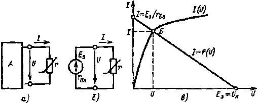 Допустим, что нелинейный элемент получает питание от эквивалентного генератора с параметрами Eэ и r0э (рис. 1.26,б), заменяющего некоторый активный двухполюсник. Тогда по второму закону Кирхгофа можно написать