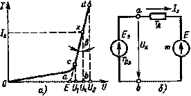 Чтобы выяснить зависимость между напряжением и током участка cd и построить схему замещения нелинейного элемента, работающего на данном участке, продлим его до пересечения в точке а с осью абсцисс и будем считать, что в точке пересечения напряжение U равно некоторой ЭДС Е.