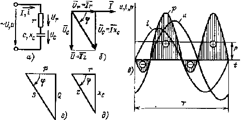Рис. 2.10 Электрическая цепь, содержащая резистивный r и емкостный С элементы (а), ее векторная диаграмма (б), графики мгновенных значений и, i, р (в). треугольники мощностей и сопротивлений (г и д)