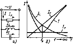 Рис. 2.19. Электрическая цепь (а) и графики зависимости Ir, IL, IC и I от частоты f (б)