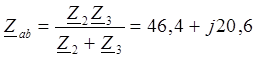 Z общ = Z 1 + Z ab + Z 4 = 71,4 + j19,4.