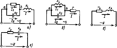 Пример 2.7. Определить характер нагрузки и параметры эквивалентных цепей схем, изображенных на рис 2.27, а и б, если xL > хС.
