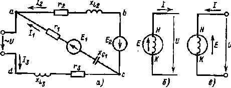 Рис. 2.28. Сложная цепь с несколькими источниками (а); действительные (положительные) направления ЭДС, напряжения и тока генератора (б), приемника (в)
