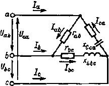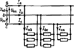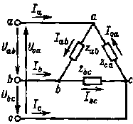 Фазные токи Iab, Ibc и Iса в общем случае не равны линейным токам Ia, Ib и Ic. Применяя первый закон Кирхгофа к узловым точкам а, b и с, можно получить следующие соотношения между линейными и фазными точками: