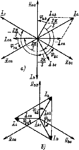 Векторная диаграмма фазных (линейных) напряжений, а также фазных токов при симметричной активно-индуктивной нагрузке приведена на рис. 3.13, а. Там же в соответствии с выражениями (3.17) построены векторы линейных токов. Следует обратить внимание на то, что при изображении векторных диаграмм в случае соединения треугольником вектор линейного напряжения Uab принято направлять вертикально вверх.