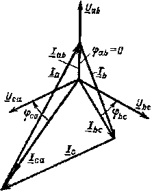 Фазные токи, углы сдвига фаз между фазными напряжениями и токами, а также фазные мощности можно определить по формулам (3.18). При несимметричной нагрузке фазные токи, углы сдвига фаз и фазные мощности будут в общем случае различными. Векторная диаграмма для случая, когда в фазе ab имеется активная нагрузка, в фазе bс — активно-индуктивная, а в фазе са — активно-емкостная (рис. 3.15), приведена на рис. 3.16. Построение векторов линейных токов произведено в соответствии с выражениями (3.17).