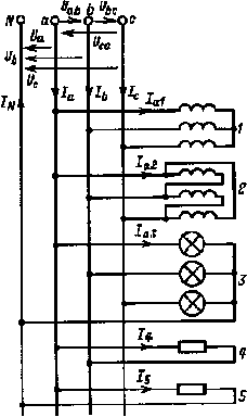 Если каждая фаза трехфазного приемника 1 рассчитана на 127 В, трехфазного приемника 2 - на 220 В, каждый приемник в группе однофазных приемников 3 - на 127 В, однофазный приемник 4 - на 220 В, а однофазный приемник 5 — на 127 В, то приемники должны быть соединены и включены, как показано на рис. 3.17.
