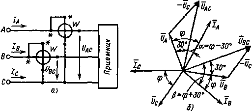 Рис. 7.14. Схема включения двух ваттметров для измерения активной мощности в трехфазных сетях ( а ) и векторная диаграмма, поясняющая измерение активной мощности двумя ваттметрами ( б )