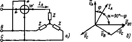 При симметричной нагрузке реактивную мощность Q трехфазной системы можно измерить одним ваттметром (рис. 7.15, а). В этой схеме токовая обмотка включена в линейный провод А, а параллельная обмотка напряжения — на линейное напряжение UBC. Из векторной диаграммы (рис. 7.15, б) следует, что показания ваттметра