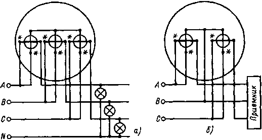 Рис 7 16. Измерение активной энергии в трехфазной сети трехэлементным ( а ) и двухэлементным ( б ) счетчиками
