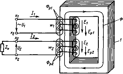 Трансформатор (рис. 8.1) состоит из ферромагнитного магнитопровода 1, собранного из отдельных листов электротехнической стали, на котором расположены две (w 1, w 2) обмотки, выполненные из медного или алюминиевого провода. Обмотку, подключенную к источнику питания, принято называть первичной, а обмотку, к которой подключаются приемники, - вторичной. Все величины, относящиеся к первичной и вторичной обмоткам, принято соответственно обозначать индексами 1 и 2.